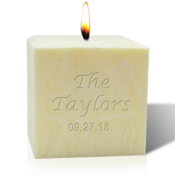 Pure Aromatherapy: 100% PALM WAX CANDLE, all cotton unbleached wick, Champagne in color. Each Vermont made, hand poured candle slowly melts (tunnels) into itself as it burns, creating the perfect holder for a tea light. The carving actually illuminates as it burns down! Our signature tunnel burn means the carved candle is yours to enjoy for years to come. It's the perfect keepsake! Enter the name and date you would like carved and select font style to customize your order. Presented in gift-ready clear acetate box. Candle measures 4" x 4" x 4".