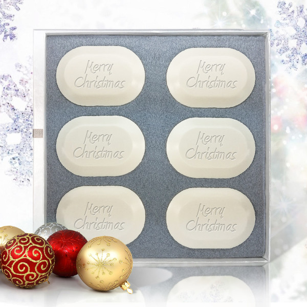 Six 4.5 oz. Triple Milled, Classic Oval Shape, VT Made Soap Bars. Gift box is a stunning pearlescent white, with a gorgeous brocade texture. Soaps are nestled in luxurious, silver velvet and gift set is finished with silver fabric ribbon. Soap Description: Made in VT, 100% Vegetable Based, Triple-Milled for Luxurious Lather, Non-GMO, Paraben Free, Phosphorus Free, Phthalate Free, Gluten Free, Nut Free, Cruelty Free, Aqua Mineral is best described as simple and clean; what you would expect a fine bar of soap to smell like, customization is carved not engraved.
